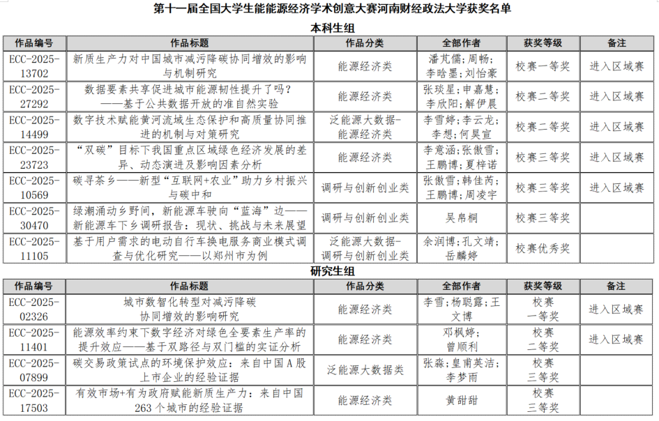 第十一届全国大学生能源经济学术创意大赛,我校报名21项,提交作品21项,经形式审查,有效作品21项。经学校组织书面评审,本科生组作品7项,研究生作品4项入围线下现场答辩环节。
