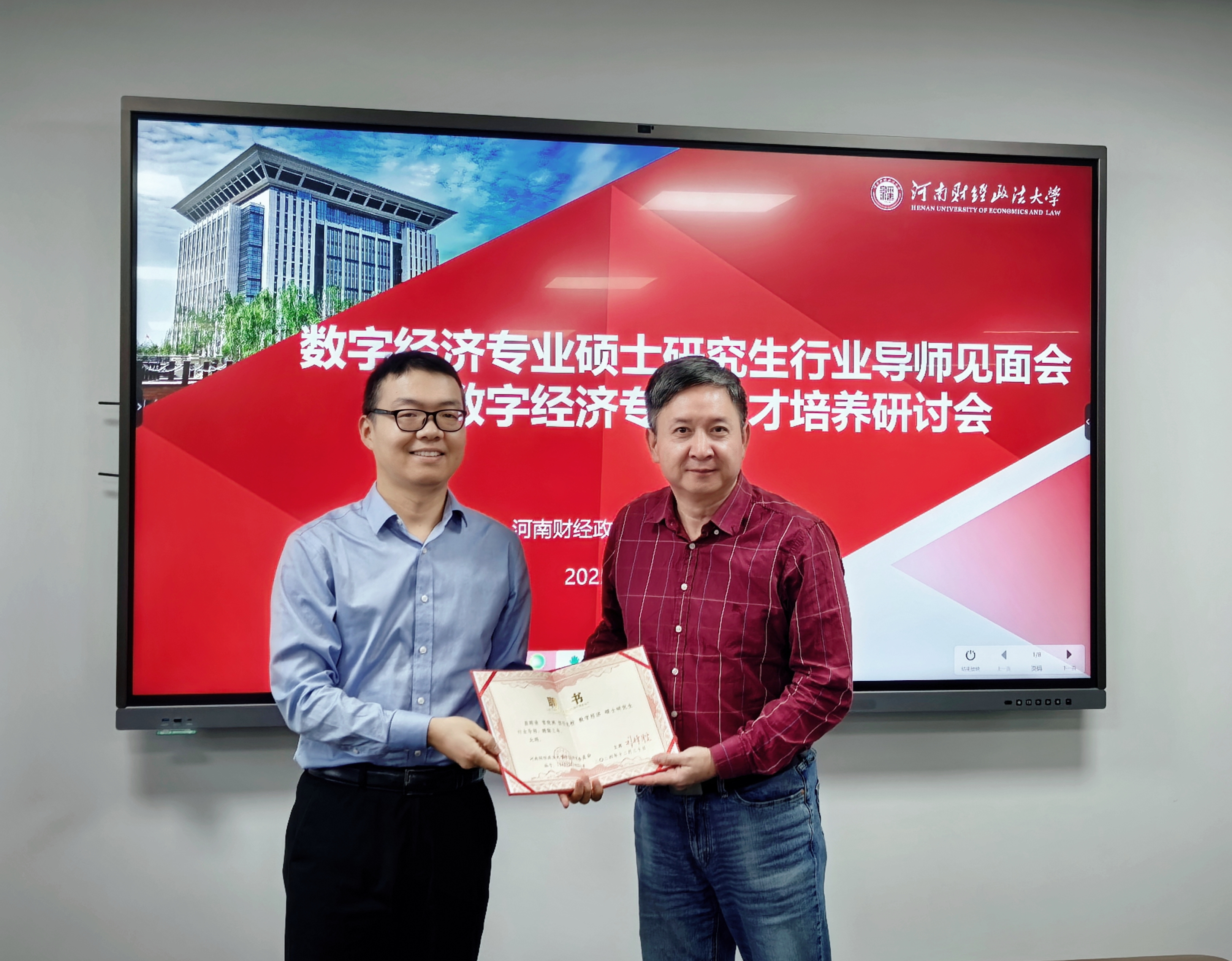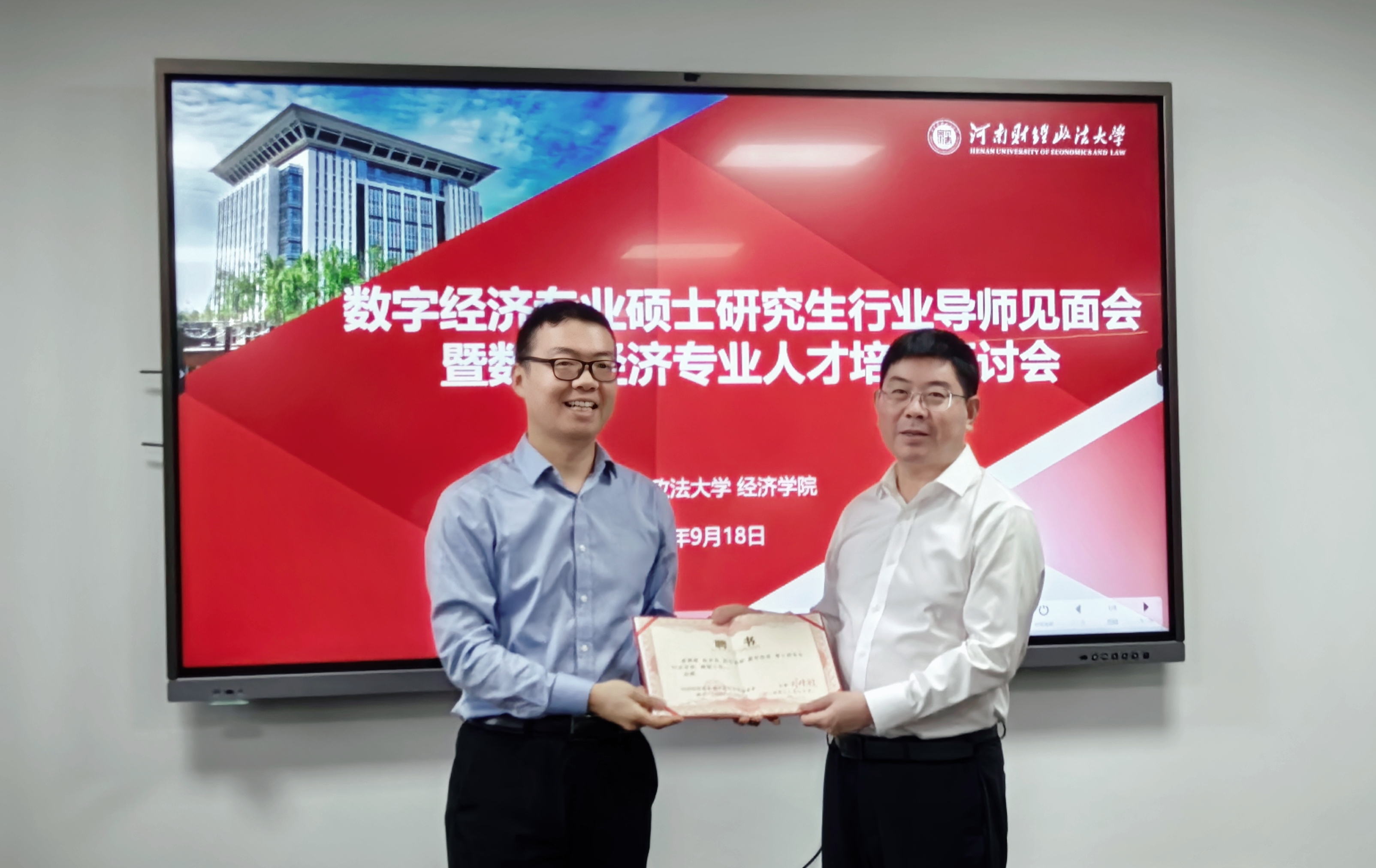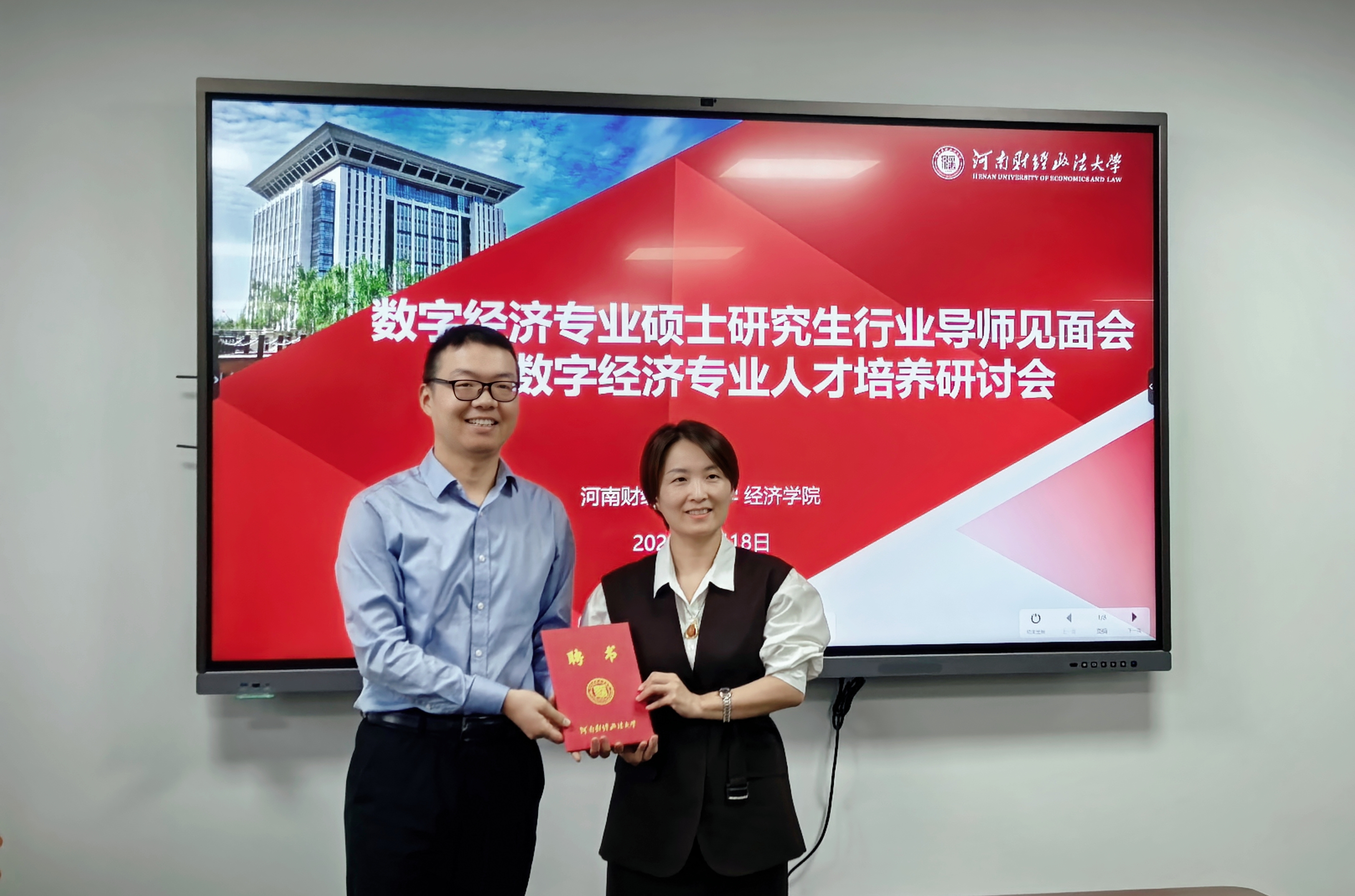 随后举行行业导师聘任仪式。弓媛媛副院长宣读行业导师名单,李凯杰院长为行业导师颁发聘书并合影留念。本次聘任的行业导师来自多个重要行业单位,河南广播电视台投资事业部副总监常晓洲、中国(河南)自由贸易试验区郑州片区管委会副主任朱召龙、豫信电子科技集团洛阳分公司总经理郝鹏、中原信托有限公司家族信托办公室总经理朱夙哲。