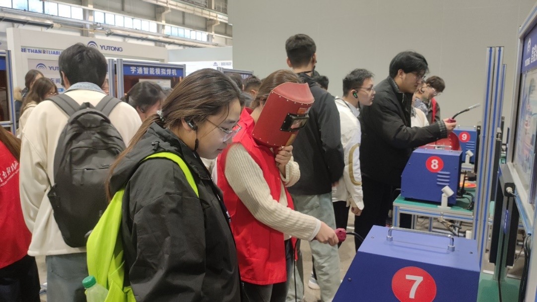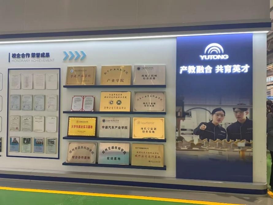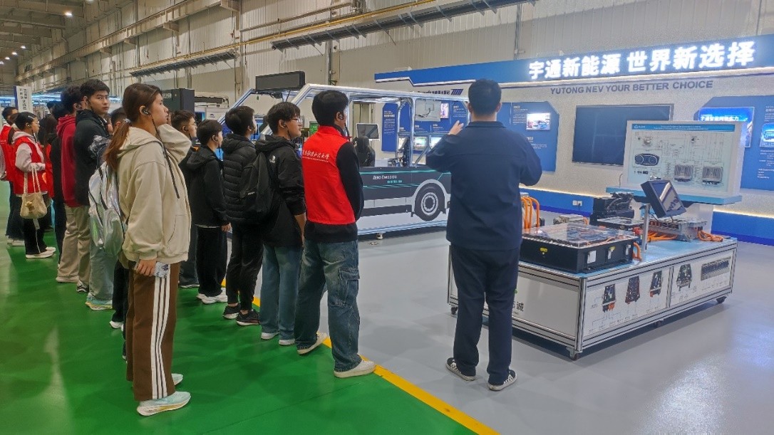 参观途中,“产教融合 共育英才”标语引发师生共鸣。作为国家职业技能实训基地,宇通的技能人才培养体系、教师企业实践流动站等校企合作机制,让学生清晰了解到复合型人才的培养路径。